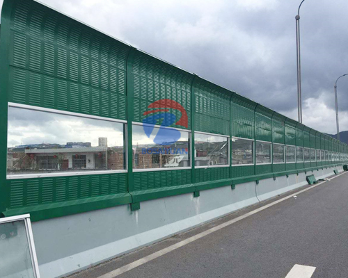 声屏障主要由钢结构立柱和吸隔声屏板两部分组成,立柱是声屏障的主要受力构件,它通过螺栓或焊接固定在道路防撞墙或轨道边的预埋钢板上;吸隔声板是主要的隔声吸声构件,它通过高强弹簧卡子将其固定在H型立柱槽内,形成声屏障。声屏障的设计已较为充分地考虑了高架高速道路、城市轻轨、地铁的风载、交通车辆的撞击安全和全天候的露天防腐问题。它外形美观大方,制作精致,运输、安装方便,造价低,使用寿命长,特别适用于高架高速道路和城市轻轨、地铁的防噪声使用。