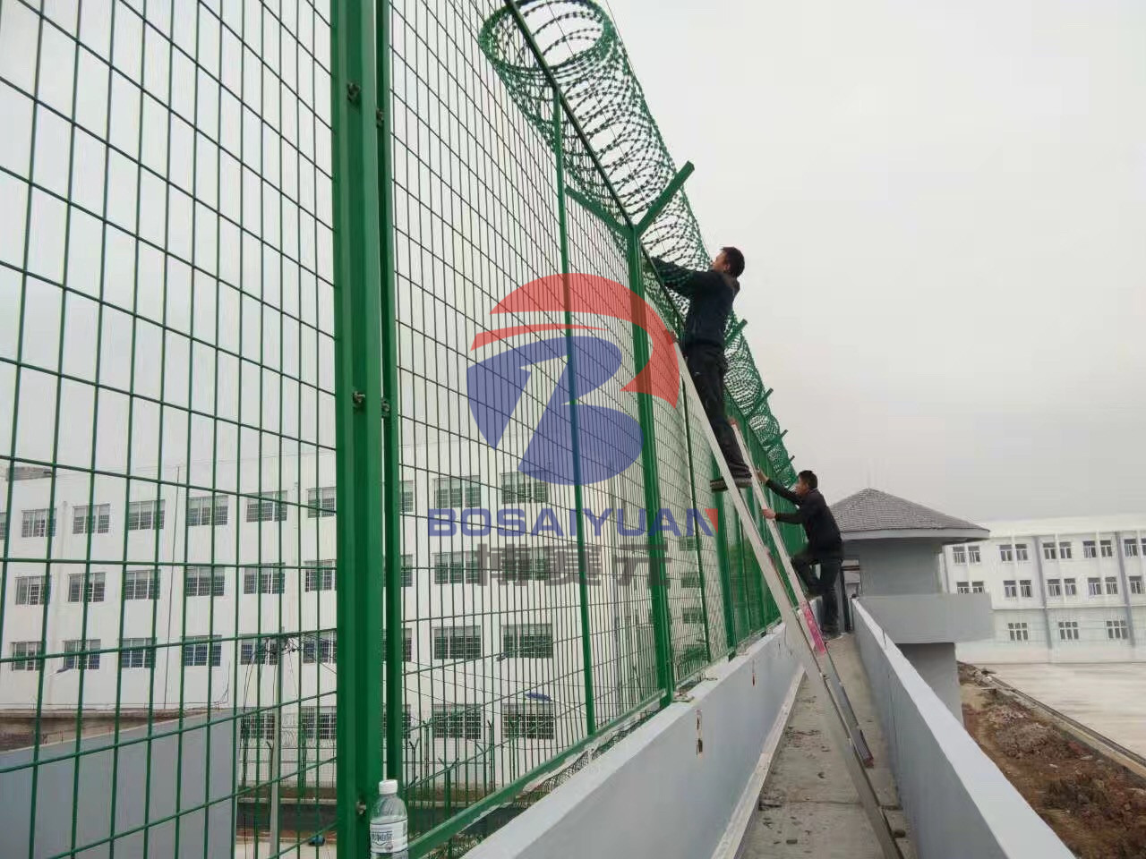 监狱护栏网又称监狱钢网墙,防攀网,监狱防护网等,主要是采用高强度的刀片刺网与普通防护网的结合,由V型支架立拄,加强型焊接片网,安全防盗连接件和刀片刺网组成。材质一般选用铝镁合金丝或是低碳钢丝。