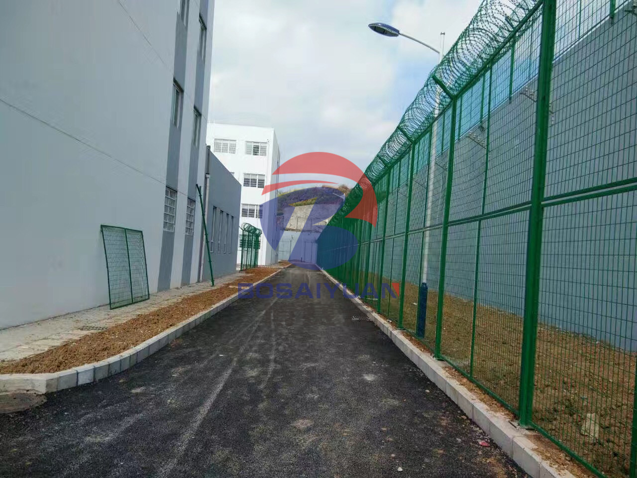 监狱护栏网又称监狱钢网墙,防攀网,监狱防护网等,主要是采用高强度的刀片刺网与普通防护网的结合,由V型支架立拄,加强型焊接片网,安全防盗连接件和刀片刺网组成。材质一般选用铝镁合金丝或是低碳钢丝。