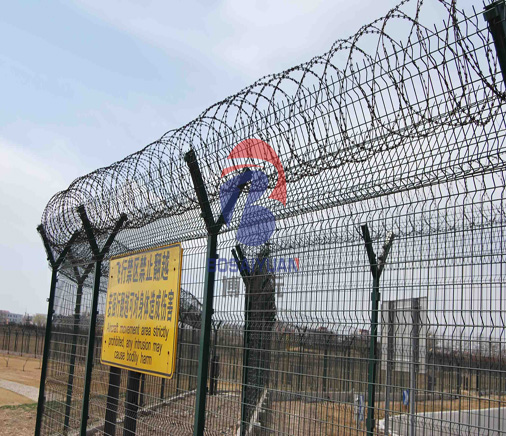 机场护栏网又称作“Y型安全防御护网”,近年来,被广泛应用在机场,军事基地等高安全场所。制作工艺有预直丝、裁剪、预弯、焊接、检验、置框、破坏性实验、美化(PE、PVC、热浸)、包装、入库。采用了低碳钢丝通过电镀、热镀、喷塑、浸塑等防腐形式,具有很好的抗老化、抗晒、耐候等特点。网片连接方式采用特制SBS紧扣件,有效防止人为的破坏性拆卸,横向四道折弯加强筋,使网面强度显著增加。